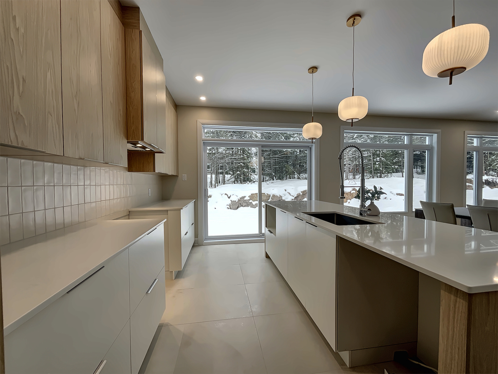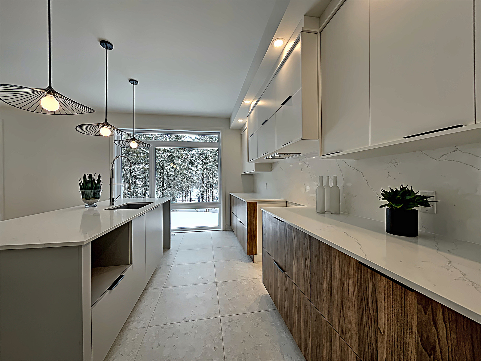 - Cuisine moderne et spacieuse : îlot central tendance, comptoirs et backsplash en quartz, et un walk-in pratique pour un rangement optimal.