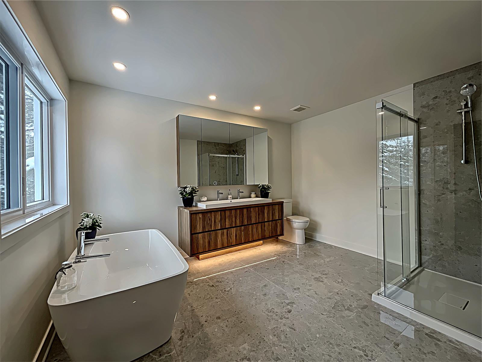 - Salle de bain de rêve très design, équipée d’éclairages LED, d’une douche en céramique de 36″ x 60″ et d’un bain autoportant, offrant un cadre de détente parfait.