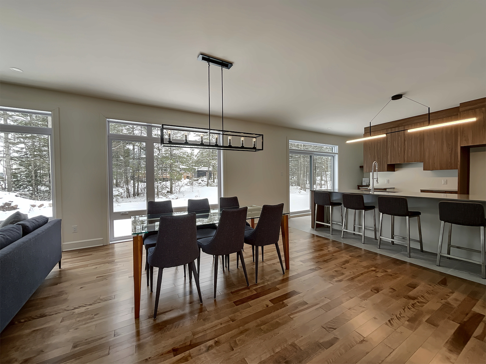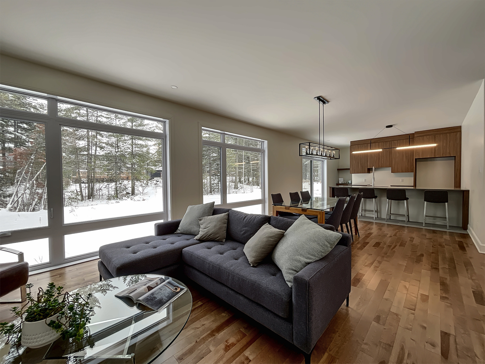 - Salon, salle à manger et cuisine ouverte, créant un espace de vie fluide et convivial.
